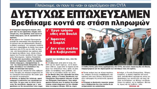 Η «Χαραυγή» τιτλοφορεί το κύριο θέμα της «Αποκαλύψεις-φωτιά» γράφει ότι στον ΔΗΣΥ ήδη κάνουν σχέδια για την ιδιωτικοποίηση της CYTA και μάλιστα έχουν καταλήξει και στην τιμή των 500 εκ. ευρώ, σύμφωνα με τον υποψήφιο Πρόεδρο της Δημοκρατίας Σταύρο Μαλά. Αλλού γράφει ότι διαβεβαιώσεις ότι η πυρίτιδα δεν εκρήγνυται αλλά μόνο αναφλέγεται και ότι χρειάζεται πυροκροτητή για να εκραγεί, έδιδε έξι μέρες πριν την έκρηξη ο συνταγματάρχης Γιώργος Γεωργιάδης, σύμφωνα με τον Γενικό Διευθυντή του ΥΠΑΜ Χρίστου Μαληκκίδη. Προβάλλει επίσης την αποδέσμευση 16,5 εκ. ευρώ από την Επιτροπή Οικονομικών της Βουλής για τις Κυπριακές Αερογραμμές.