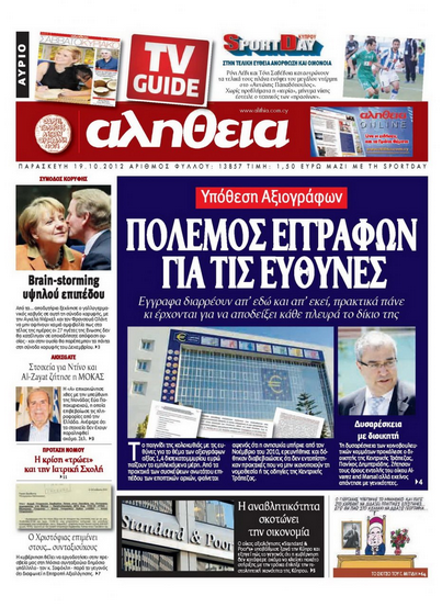Η «Αλήθεια» τιτλοφορεί το κύριο θέμα της «Πόλεμος εγγράφων για τις ευθύνες» και γράφει ότι το παιχνίδι της κολοκυθιάς με τις ευθύνες για το θέμα των αξιόγραφων αξίας 1,4 δισεκατομμυρίου ευρώ παίζουν τα εμπλεκόμενα μέρη. Σε άλλη στήλη γράφει ότι η «Α» επικοινώνησε με την υπεύθυνη της Μονάδας Καταπολέμησης Αδικημάτων Συγκάλυψης ΜΟΚΑΣ, Εύη Παπακυριακού, η οποία επιβεβαίωσε ότι ζητήθηκαν τα στοιχεία για τον Ντίνο Μιχαηλίδη και Fouad Al-Zayat στο σκάνδαλο σχετικά με τον πρώην υπουργό Άμυνας της Ελλάδας Ακη Τσοχατζόπουλο. Αλλού γράφει ότι ο οίκος αξιολόγησης «Standard & Poor’s” υποβάθμισε ξανά την Κύπρο και εξηγεί πως το γεγονός ότι η κυβέρνηση δεν κατάφερε ακόμα να κλείσει το πακέτο στήριξης με την τρόικα έπληξε την πιστοληπτική ικανότητα της Κύπρου.