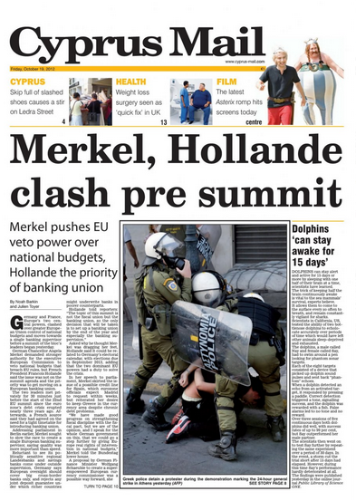 Η αγγλόγλωση «Cyprus Mail», με κύριο τίτλο «Μέρκελ, Ολάντ σε διαφωνία πριν από τη σύνοδο», γράφει ότι οι δύο διαφώνησαν σε μεγαλύτερο έλεγχο των εθνικών προϋπολογισμών από την ΕΕ. Σε άλλη στήλη, γράφει ότι κατάστημα υποδημάτων στην Οδό Λήδρας, στη Λευκωσία, πέταξε παλιό στοκ 12-15 ετών, σε κάδο απορριμμάτων, προκαλώντας την οργή πολιτών που στην προσπάθειά τους να πάρουν τα παπούτσια, είδαν ότι όλα είχαν, εσκεμμένα, σχίσμα στη μέση. Αλλού προβάλλει μεγάλη φωτογραφία από τις χθεσινές διαμαρτυρίες στην Αθήνα.