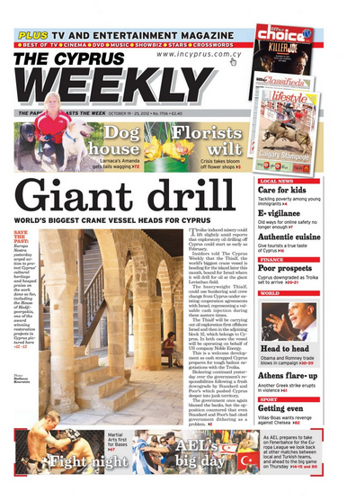 Η αγγλόγλωση εβδομαδιαία «The Cyprus Weekly», κάτω από τον πρωτοσέλιδο τίτλο «Τεράστιο γεωτρύπανο», αναφέρει ότι το μεγαλύτερο γεωτρύπανο στον κόσμο, το Thialf, έρχεται στην Κύπρο για την έναρξη των γεωτρήσεων τον ερχόμενο Φεβρουάριο. Σε άλλη στήλη, αναφέρεται στην ανάγκη για μείωση της φτώχειας ανάμεσα στα παιδιά των μεταναστών και εθνικών μειονοτήτων. Η «CW» προβάλλει επίσης την εκλογική αναμέτρηση στις ΗΠΑ μεταξύ Μπαράκ Ομπάμα και Μικ Ρόμνι, και γράφει ότι και οι δύο υποψήφιοι προσπαθούν να δελεάσουν τις γυναίκες ψηφοφόρους.
