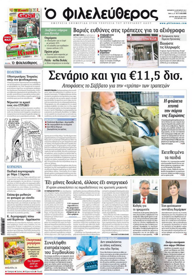 «Ο Φιλελεύθερος», κάτω από τον τίτλο «Σενάριο και για 11,5 δις», γράφει εικοσιτετράωρα ιδιαίτερα κρίσιμα είναι τα επόμενα αφού θα καθορίσουν το μέλλον της κυπριακής οικονομίας. Το Σαββατοκυρίακο κλείνει το κείμενο αντιμέτρων και προτάσεων που αφορά τις τράπεζες. Σε άλλη στήλη αναφέρει ότι η Τράπεζα Κύπρου και η Λαϊκή είναι αντιμέτωπες με πρόστιμα, μετά από τα ευρήματα έρευνας της Κεντρικής Τράπεζας για τις πρακτικές που ακολούθησαν στη διάθεση αξιογράφων. Γράφει σε σχετικό φωτορεπορτάζ ότι η οικονομική κρίση τρίζει για τα καλά τα δόντια της και η ύφεση που περνά η Ευρώπη έχει αντίκτυπο στους ανθρώπους με ραγδαία αύξηση του αριθμού των πτωχών και εντός της Ευρωζώνης.