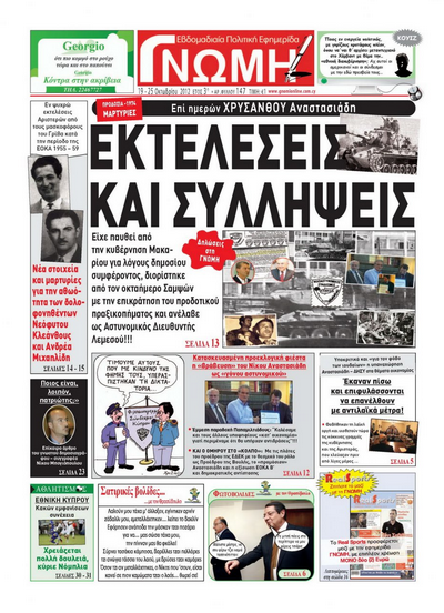 Η εβδομαδιαία «Γνώμη» προβάλλει το κύριο θέμα της με τίτλο «Εκτελέσεις και συλλήψεις» και γράφει ότι πατέρας του Προέδρου του ΔΗΣΥ, Χρύσανθος, είχε παυθεί από την κυβέρνηση Μακαρίου από τη θέση του αστυνομικού για λόγους δημοσίου συμφέροντος, επανήλθε μετά την επικράτηση του πραξικοπήματος και ανέλαβε, παράνομα, χρέη Αστυνομικού Διευθυντή Λεμεσού. Γράφει σε άλλη στήλη ότι υποκριτικά και για το ‘φόβο των Ιουδαίων’ η υπαναχώρηση Αναστασιάδη – ΔΗΣΥ και συνοδοιπόρων τους στα θέματα οικονομίας. Επιφυλάσσονται να επανέλθουν με αντιλαϊκά μέτρα, αναφέρει το δημοσίευμα. Η «Γ» αναφέρεται επίσης σε «εν ψυχρώ εκτελέσεις Αριστερών από τους μασκοφόρους του Γρίβα κατά την περίοδο της ΕΟΚΑ 1955-59».