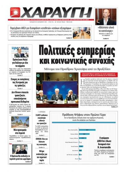 Η «Χαραυγή» προβάλλει το κύριο θέμα της με τίτλο «Πολιτικές ευημερίας και κοινωνικής συνοχής» και αναφέρει ότι αυτό είναι το μήνυμα του Προέδρου της Δημοκρατίας κατά τη σύνοδο κορυφής της ΕΕ, προτάσσοντας τη δημιουργία θέσεων και εφαρμογή του Συμφώνου της ΕΕ για την Ανάπτυξη και την Απασχόληση. Αναφέρεται επίσης σε δημοσκόπηση που έγινε για λογαριασμό του ΡΙΚ και γράφει ότι η απόφαση ΔΗΚΟ δεν έδωσε δυναμική στον Πρόεδρο του ΔΗΣΥ. Πολλά είναι, προσθέτει, τα περιθώρια συσπείρωσης του ΑΚΕΛ, σύμφωνα με τη δημοσκόπηση. Σε άλλη στήλη, αναφέρει ότι μια εντελώς ανανεωμένη προκυμαία παραδόθηκε στη Λεμεσό. Πρόκειται για το πολυλειτουργικό παραθαλάσσιο πάρκο, το δυτικό μέρος του οποίου παραδόθηκε χθες από το Δήμαρχο Λεμεσού Αντρέα Χρίστου.
