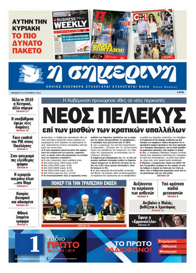 «Η Σημερινή», με κύριο τίτλο «Νέος πέλεκυς επί των μισθών των κρατικών υπαλλήλων», γράφει ότι η Κυβέρνηση προχώρησε σε νέες οδυνηρές περικοπές στους μισθούς των εργαζομένων στο δημόσιο και ημιδημόσιο τομέα, προκαλώντας τις αντιδράσεις των συντεχνιών. Από 1001-1500 ευρώ: 6,5%, 15001-2000 8,5%, 2001-3000 9,5%, 3001-4000 11,5% και από 4001 ευρώ και άνω 12,5%. Σε άλλη στήλη γράφει ότι σύμφωνα με τη χθεσινοβραδινή δημοσκόπηση του ΡΙΚ, η παράσταση νίκης ανήκει στον Νίκο Αναστασιάδη με 67% και με πρόθεση ψήφου 37%, ο Σταύρος Μαλάς λαμβάνει 23,8% και ο Γιώργος Λιλλήκας 17%. Μόλις 6% δηλώνουν ικανοποιημένοι από τον Δημήτρη Χριστόφια. Προβάλλει αλλού ότι η διάθεση τροφίμων ελάχιστης διατηρησιμότητας, εκτός όσων προσδιορίζονται από την κείμενη νομοθεσία ως ευαλλοίωτα, θα πωλούνται υπό προϋποθέσεις.