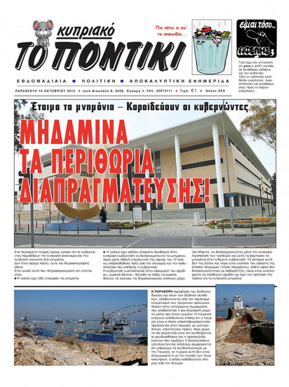 Το εβδομαδιαίο «Το κυπριακό ποντίκι», με πρωτοσέλιδο τίτλο «Μηδαμινά τα περιθώρια διαπραγμάτευσης», γράφει ότι η εφημερίδα πληροφορείται ότι η τρόικα έχει ήδη ετοιμάσει το μνημόνιο, έχει αφήσει ελάχιστα περιθώρια στην κυπριακή κυβέρνηση για να διαπραγματευτεί το μνημόνιο παρά μόνο πιθανή επιμήκυνσή του. Προβάλλει και φωτογραφικά τον παράνομο ελλιμενισμό τουρκικών πολεμικών πλοίων στην κατεχόμενη Αμμόχωστο, σε μια παράφορη παραβίαση του διεθνούς δικαίου και όλων των διεθνών συνθηκών. Σε άλλη στήλη γράφει ότι αστυνομική δύναμη από την Κύπρο βρίσκεται στη στις Βρυξέλλες, ενισχύοντας την ομάδα ασφάλειας του Ευρωπαϊκού Συμβουλίου.
