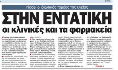 «Η Σημερινή» τιτλοφορεί το κύριο θέμα της «Στην Εντατική οι κλινικές και τα φαρμακεία» και γράφει ότι την ώρα που τα κρατικά νοσηλευτήρια βρίσκονται αντιμέτωπα με τον υπερπληθυσμό και αδυνατούν να αντεπεξέλθουν εξαιτίας της ανεπαρκούς στελέχωσης, ως αποτέλεσμα της οικονομικής κρίσης, αντίθεση είναι η εικόνα που επικρατεί στον ιδιωτικό τομέα ο οποίος είναι σε απελπιστική κατάσταση με τον κύκλο εργασιών τους να μειώνεται μέχρι και 60%. Σε άλλη στήλη, αναφέρει ότι συνταξιούχοι δημοσιογράφοι τίμησαν χθες τον πρώην πρόεδρο της Δημοκρατίας Γλαύκο Κληρίδη. Αλλού αναφέρει ότι λύπη για την απόλυση των τεσσάρων Ελλαδιτών επιστημόνων από τη ΔΕΑ εξέφρασε ο εκπρόσωπος της ε/κ πλευράς, Αριστος Αριστοτέλους.