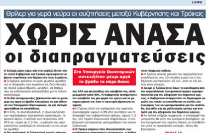 Οι χθεσινές μαραθώνιες διαπραγματεύσεις Κυβέρνησης και Τρόικας με στόχο να επιτευχθεί συμφωνία στα μεγάλα ζητήματα του δημοσιονομικού τομέα είναι το κύριο θέμα στα πρωτοσέλιδα του συνόλου του κυπριακού Τύπου της Τρίτης. Άλλα θέματα που προβάλλονται πρωτοσέλιδα είναι η επιστολή Αναστασιάδη προς τον Πρόεδρο Χριστόφια για τον χρηματοπιστωτικό τομέα, οι επιθέσεις στη Γάζα, η απόφαση της Επιτροπής Ελέγχου να εξετάσει τη δυνατότητα φορολογικού ελέγχου των Κυπρίων καταθετών σε τράπεζες του εξωτερικού, η παραχώρηση 90 οικοπέδων αυτοστέγασης σε πρόσφυγες και ο θάνατος της ογκολόγου Χέλεν Σωτηρίου.