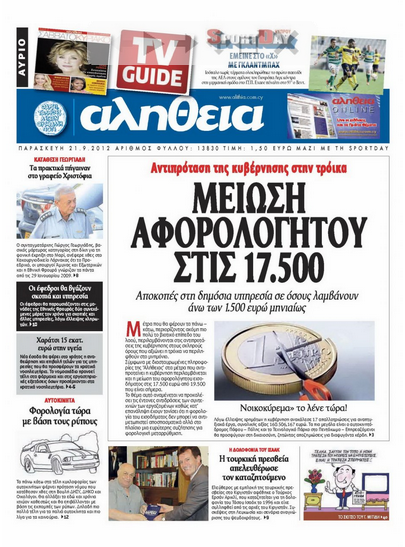 Η «Αλήθεια» στο κύριο της θέμα με τίτλο «Μείωση αφορολόγητου στις 17.500», γράφει ότι μέτρα που θα φέρουν τα πάνω-κάτω, περιορίζοντας ακόμη πιο πολύ το βιοτικό επίπεδο του λαού, περιλαμβάνονται στις αντιπροτάσεις της Κυβέρνησης στους σκληρούς όρους που αξιώνει η Τρόικα», με ένα από αυτά να προνοεί τη μείωση του αφορολόγητου εισοδήματος από 19.500 ευρώ στις 17.500. Αλλού γράφει ότι η τουρκική πρεσβεία στο Κιργιστάν απελευθέρωσε τον καταζητούμενο για το φόνο του Τάσου Ισαάκ, Ερσάν Αρικλί. Σε άλλο της θέμα, γράφει ότι οι έφεδροι θα παρουσιάζονται δύο συνεχόμενες φορές το χρόνο για σκοπιές και άλλες υπηρεσίες λόγω έλλειψης κληρωτών.