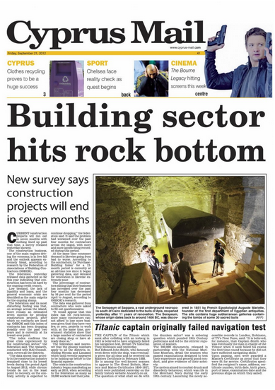 Η αγγλόγλωσση εφημερίδα “Cyprus Mail”, στο κύριο της θέμα με τίτλο «Ο κατασκευαστικός τομέας κτυπάει πάτο», γράφει ότι σύμφωνα με έρευνα της Ομοσπονδίας Συνδέσμων Εργολάβων Οικοδομών Κύπρου, η οικοδομική βιομηχανία βρίσκεται σε ελεύθερη πτώση, καθώς μετά από επτά μήνες –όταν ολοκληρωθούν τα έργα που βρίσκονται σε εξέλιξη- δεν υπάρχει ούτε ένα έργο υπό ανέγερση στην Κύπρο. Αλλού, γράφει ότι στην Κύπρο αποδείχθηκε μεγάλη επιτυχία η ανακύκλωση ρούχων. Σε φωτορεπορτάζ, η εφημερίδα γράφει για τη νεκρόπολη Serapeum of Saqqara στην Αίγυπτο, η οποία άνοιξε χθες μετά από 11 χρόνια εργασιών ανακαίνισης.
