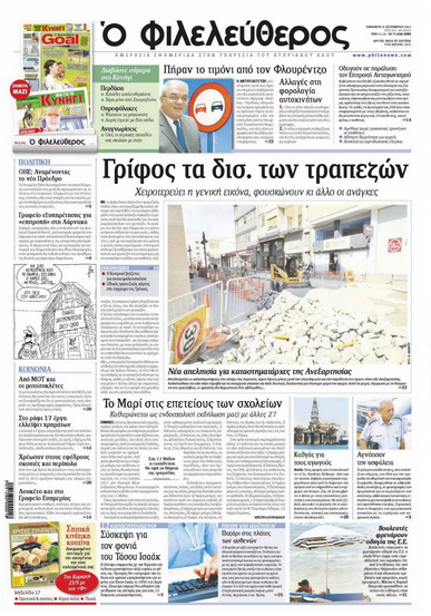 Ο «Φιλελεύθερος» κάτω από τον τίτλο «Γρίφος τα δις των τραπεζών», γράφει στο κύριο του θέμα ότι την ερχόμενη εβδομάδα η Κεντρική Τράπεζα καθορίζει το μέγιστο ποσό που θα απαιτηθεί για ανακεφαλαιοποίηση των τραπεζών, ενώ το ποσό των 6 δις ευρώ που διέρρευσε ως πρώτη εκτίμηση κινδυνεύει να μην ισχύει. Αλλού, γράφει ότι το Μαρί περιλαμβάνεται στις επετείους των σχολείων και θα τιμάται η μνήμη όσων θυσιάστηκαν σε εκδήλωση που θα πραγματοποιείται στις 11 Μαΐου. Σε άλλο του θέμα, γράφει ότι προωθείται από Βουλευτές ως πρόταση νόμου το «καταχωνιασμένο εδώ και επτά μήνες» από το Υπουργείο Συγκοινωνιών Νομοσχέδιο για νέα τέλη εγγραφής και νέες άδειες κυκλοφορίας αυτοκινήτων.