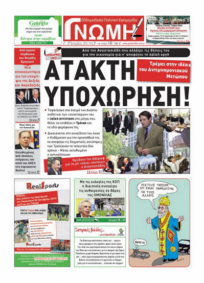 Η εβδομαδιαία εφημερίδα η «Γνώμη», στο κύριο της θέμα με τίτλο «Ατακτη υποχώρηση», γράφει ότι ο Νίκος Αναστασιάδης αλλάζει τις θέσεις του για την οικονομία για να αποφύγει τη λαϊκή οργή. Αλλού, γράφει ότι ο Νίκος Αναστασιάδης δίνει διέξοδο στον εθνικιστή Τ/κ ηγέτη για εκτροπή του Κυπριακού από τα πλαίσια του ΟΗΕ. Σε άλλο της θέμα, η Γνώμη γράφει ότι ο Ευρωβουλευτής Ιωάννης Κασουλίδης βρέθηκε «εκτεθειμένος από ύπουλες ενέργειες του κατά του ΑΚΕΛ στο ευρωκοινοβούλιο».