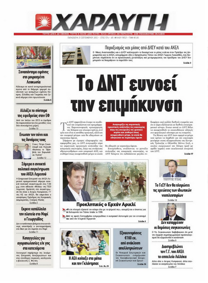 Η «Χαραυγή», στο κύριο της θέμα με τίτλο «Το ΔΝΤ ευνοεί την επιμήκυνση», γράφει ότι το ΔΝΤ εμφανίζεται έτοιμο να αποδεχτεί την επιμήκυνση του προγράμματος δημοσιονομικής προσαρμογής της Κύπρου στα τέσσερα χρόνια αντί τρία που είναι η συνήθης πρακτική, αλλά και αποφυγή μέτρων που θα οδηγούσαν σε περαιτέρω ύφεση. Αλλού, γράφει για τις δηλώσεις του Υπουργού Υγείας και υποψήφιου για την Προεδρεία της Δημοκρατίας Σταύρου Μαλά, ότι το ΓεΣΥ δεν θα πληρώσει τις χρεώσεις των ιδιωτικών νοσηλευτηρίων. Σε άλλο της θέμα, η «Χαραυγή» φιλοξενεί τις δηλώσεις του Εκπροσώπου Τύπου του ΑΚΕΛ, ο οποίος είπε ότι «ο Νίκος Αναστασιάδης και ο ΔΗΣΥ καλλιεργούν το διχασμό και το μίσος ενάντια στον Πρόεδρο της Δημοκρατίας και το ΑΚΕΛ».