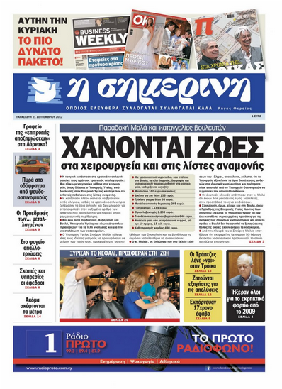 Η «Σημερινή», υπό τον τίτλο «Χάνονται ζωές», γράφει στο κύριο της θέμα ότι στα κρατικά νοσηλευτήρια χάνονται ζωές, με τον Υπουργό Υγείας να δηλώνει ότι ηλικιωμένη πέθανε στο χειρουργείο και Βουλευτές να καταγγέλλουν στην Επιτροπή Υγείας ότι ασθενείς πεθαίνουν στις λίστες αναμονής. Αλλού γράφει ότι 17χρονος φαίνεται να εκπορνευόταν μαζί με άλλες δέκα κοπέλες σε μπιραρία στη Λευκωσία, με τον ύποπτο διαχειριστή του υποστατικού να συλλαμβάνεται. Σε άλλο της θέμα, η «Σημερινή», γράφει ότι σύμφωνα με καταγγελία του Βουλευτή Σοφοκλή Φυττή, Ε/κ και Τ/κ διατηρούν γραφείο στη Λάρνακα, στο οποίο Ε/κ υποβάλλουν αιτήσεις στην παράνομη «επιτροπή αποζημιώσεων» που λειτουργεί στα κατεχόμενα.