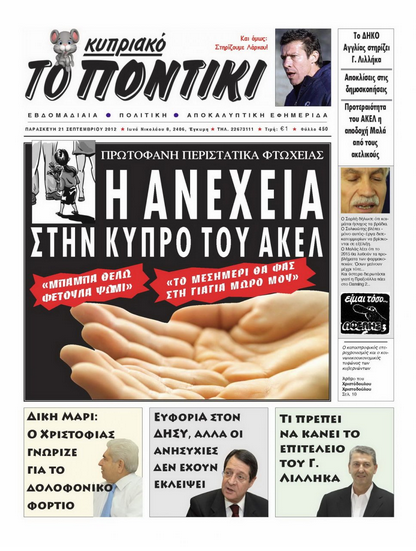 Η εβδομαδιαία εφημερίδα «Το κυπριακό Ποντίκι», στο κύριο του θέμα με τίτλο «Η ανέχεια στην Κύπρο του ΑΚΕΛ», γράφει ότι πληθαίνουν οι περιπτώσεις πραγματικής ανέχειας στην Κύπρο του 2012, λόγω της πρωτοφανούς οικονομικής κρίσης που μαστίζει τον τόπο, «ως συνέχεια της εγκληματικής και ανίκανης οικονομικής πολιτικής της απερχόμενης διακυβέρνησης». Αλλού, γράφει, σε σχέση με τη δίκη για τη φονική έκρηξη στο Μαρί, ότι ο Πρόεδρος Χριστόφιας και οι Υπουργοί Εξωτερικών και Αμυνας ήταν ενήμεροι από γραπτά σημειώματα για το επικίνδυνο φορτίο. Σε άλλο θέμα γράφει ότι η προτεραιότητα του ΑΚΕΛ είναι η αποδοχή του υποψήφιου Πρόεδρου Σταύρου Μαλά από τους ΑΚΕΛικούς.