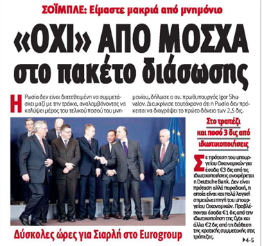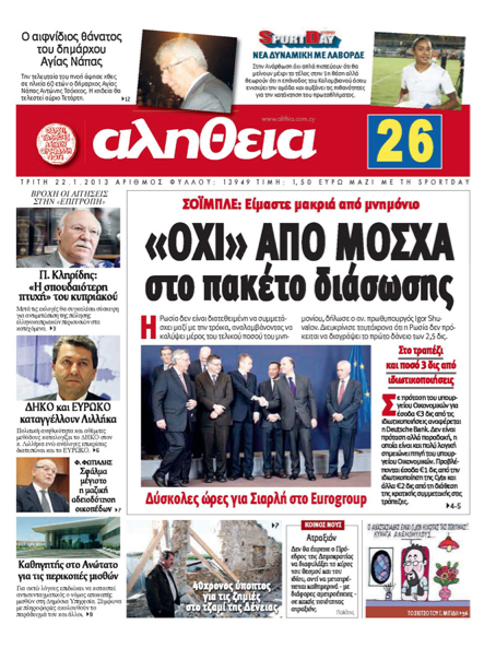 Η «Αλήθεια» τιτλοφορεί το κύριο θέμα της « ‘ Όχι’ από Μόσχα στο πακέτο διάσωσης» και γράφει ότι η Ρωσία δεν είναι διατεθειμένη να συμμετάσχει μαζί με την τρόικα, αναλαμβάνοντας να καλύψει μέρος του τελικού ποσού του μνημονίου, δήλωσε ο αναπληρωτής Πρωθυπουργός Igor Shuvalon. Είπε επίσης ότι δεν πρόκειται να διαγράψει το πρώτο δάνειο των 2,5 δις. Σε άλλη είδηση, γράφει ότι ο Γενικός Εισαγγελέας Πέτρος Κληρίδης δήλωσε ότι μετά τις εκλογές θα συγκαλέσει σύσκεψη για αντιμετώπιση της πώλησης ελληνοκυπριακών περιουσιών στα κατεχόμενα. Γράφει αλλού ότι καθηγητής προσέφυγε στο Ανώτατο Δικαστήριο όπου με οκτώ λόγους επιδιώκει να καταστεί αντισυνταγματικός ο νόμος αποκοπής μισθών στη Δημόσια Υπηρεσία.