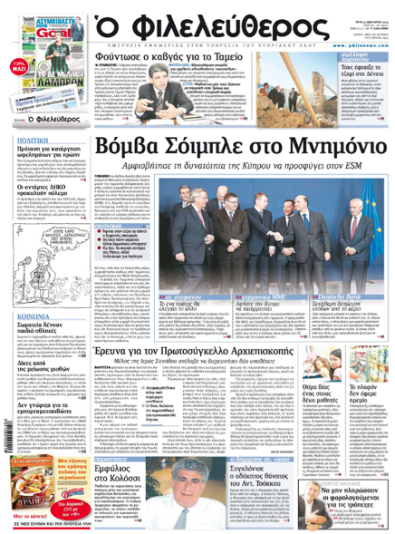 «Ο Φιλελεύθερος», κάτω από τον πρωτοσέλιδο τίτλο «Βόμβα Σόιμπλε στο Μνημόνιο», γράφει ότι τον ασκό του Αιόλου άνοιξε χθες για το κυπριακό μνημόνιο ο Υπουργός Οικονομικών της Γερμανίας Βόλγφκάγκ Σόιμπλε καθώς αμφισβήτησε κατά πόσον η Κύπρος καλύπτεται κανονιστικά και μπορεί να είναι δικαιούχος βοήθειας από τον Ευρωπαϊκό Μηχανισμό Στήριξης. Γράφει αλλού ότι βαθύτερα φαίνεται να είναι τα αιτία της παραίτησης του Πρωτοσύγκελου της Αρχιεπισκοπής Ιερώνυμου από τα διοικητικά του καθήκοντά του. Μέλος της Ιεράς Συνόδου ανέλαβε να διερευνήσει δύο διαφορετικές υποθέσεις. Γράφει αλλού ότι παστεριωτές, σύνδεσμοι καταναλωτών και υπεραγορών και περιπτεράδες διαμαρτύρονται έντονα για την επιβολή του πλαφόν στη χοντρική και στη λιανική τιμή του γάλατος.