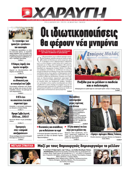 Η «Χαραυγή» στο κύριο θέμα της με τίτλο «Οι ιδιωτικοποιήσεις θα φέρουν νέα μνημόνια» γράφει ότι οι ιδιωτικοποιήσεις και η πώληση κρατικής περιουσίας θα φέρουν πρόσθετα μέτρα με είσοδο στο φαύλο κύκλο του δεύτερου και τρίτου μνημονίου, δήλωσε ο υποψήφιος για την προεδρία της Δημοκρατίας Σταύρος Μαλάς, τονίζοντας ότι το ζητούμενο είναι ο χρόνος αποπληρωμής και η δόση να καθιστούν το χρέος βιώσιμο. Σε άλλη στήλη αναφέρεται σε ομιλία του Προέδρου της Δημοκρατίας Δημήτρη Χριστόφια, ο οποίος είπε ότι η κυβέρνηση προσπάθησε να κτίσει ένα κοινωνικό κράτος και να στηρίξει τους εργαζομένους αλλά η κρίση δημιούργησε προβλήματα. Αλλού αναφέρει ότι ομόφωνη είναι η θέση Διεύθυνσης, συντεχνιών και ΔΣ της ΑΤΗΚ για συμμετοχή στις διαβουλεύσεις για το μέλλον του οργανισμού.
