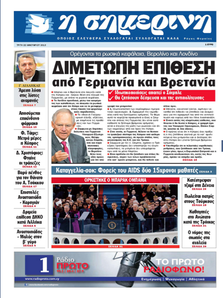 «Η Σημερινή» προβάλλει το κύριο θέμα της με τίτλο «Διμέτωπη επίθεση από Γερμανία και Βρετανία» και γράφει ότι η Βρετανία παίρνει θέση στο πλευρό της Γερμανίας και μέσω του κουρέματος των καταθέσεων προσδοκά να σηκώσει τα κεφάλαια από την Κύπρο και να τα μεταφέρει στους δικούς της φορολογικούς παραδείσους. Προβάλλει επίσης τη χθεσινή επίσημη τελετή ορκωμοσίας μπροστά στο Καπιτώλιο του Αμερικανού Προέδρου Μπαράκ Ομπάμα, ο οποίος ξεκίνησε τη δεύτερη του θητεία στην προεδρία των ΗΠΑ. Γράφει σε άλλη στήλη ότι 40χρονος συνελήφθη για διαλεύκανση της υπόθεσης βεβήλωσης τζαμιού στη Δένεια, όπου διεξάγονται εργασίες αναστήλωσης.