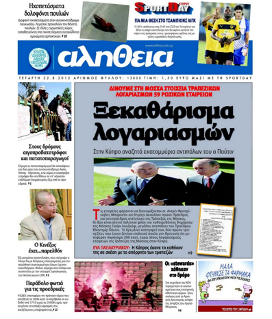 «Ξεκαθάρισμα λογαριασμών» είναι ο κύριος τίτλος της «Αλήθειας» που γράφει ότι ο Πούτιν αναζητά εκατομμύρια αντιπάλων του στην Κύπρο και ότι παραχωρήθηκαν στο Κρεμλίνο στοιχεία λογαριασμών 59 ρωσικών εταιρειών στο νησί. Φιλοξενούνται και δηλώσεις της προϊσταμένης της ΜΟΚΑΣ Εύας Παπακυριακού σε σχέση με το απόρρητο των τραπεζών. Αλλού η «Α» αναφέρεται στις εκδηλώσεις διαμαρτυρίας των αιγοπροβατοτρόφων και των πατατοπαραγωγών για ικανοποίηση αιτημάτων τους. Επίσης η εφημερίδα στο πρωτοσέλιδό της αναφέρεται στη σημερινή συνάντηση του Κινέζου επιχειρηματία με τον Υπουργό Συγκοινωνιών και γράφει ότι ο Γιανγκ Κι στο παρελθόν είχε υπογράψει άλλα έξι μνημόνια συναντίληψης με Κύπριους επιχειρηματίες για επενδύσεις που δεν προχώρησαν ποτέ.