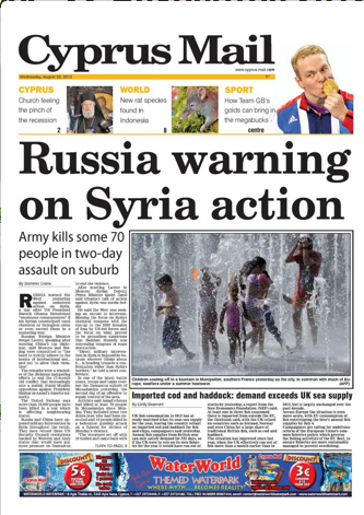 Η αγγλόγλωσση “Cyprus Mail” έχει κύριο τίτλο «Προειδοποιεί η Ρωσία για το ενδεχόμενο ανάληψης δράσης στη Συρία» και αναφέρεται στις δηλώσεις το Ρώσου ΥΠΕΞ Σεργκέι Λαβρόφ κατά μιας μονομερούς στρατιωτικής δράσης στη συρία καθώς και στις εξελίξεις στο πεδίο των μαχών όπου τις τελευταίες δύο μέρες σκοτώθηκαν άλλοι 70 άνθρωποι. Αλλού η εφημερίδα αναφέρεται στη πρόθεση της Εκκλησίας για περικοπές σε μισθούς και στις αποφάσεις που θα ληφθούν σε συνεδρίαση της Ιεράς Συνόδου αρχές Σεπτεμβρίου. Αλλού αναφέρεται στις αντιδράσεις που προκαλεί η ανακοίνωση της νέας τιμολογιακής πολιτικής για τα φάρμακα.