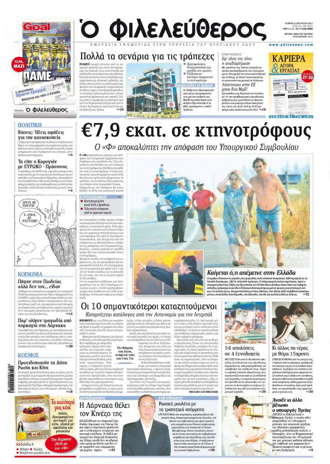 Με τίτλο «€7,9 εκατ. σε κτηνοτρόφους» «ο Φιλελεύθερος» αναφέρεται σήμερα στο κύριό του θέμα την πρόσφατη απόφαση του Υπουργικού συμβουλίου για την ενίσχυση του κλάδου, ενίσχυση η οποία όπως γράφει το δημοσίευμα, είναι κουτσουρεμένη κατά 50% και η τελευταία σύμφωνα με τις πρόνοιες της συνθήκης προσχώρησης της Κύπρου στην ΕΕ. Αλλού ο «Φ» αναφέρει ότι πολλά είναι τα σενάρια που μελετώνται από τις τράπεζες με στόχο τον περιορισμό της έκθεσής τους στο ελληνικό χρέος μεταξύ αυτών η ανταλλαγή χαρτοφυλακίων, συμφωνίες για εκπροσώπηση σε άλλες χώρες ή και εξαγορές μεριδίων, η θυγατροποίηση κτλ. Επίσης η εφημερίδα πρωτοσέλιδα αναφέρεται σε καταρτισμό καταλόγου από την Αστυνομία για την Ιντερπόλ με τους 10 σημαντικότερους καταζητούμενους στην Κύπρο και αναφέρει πως ήδη έχουν καταχωρηθεί οι οκτώ, έξι Κύπριοι και δυο αλλοδαποί.