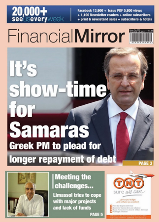 Η εβδομαδιαία εφημερίδα «Financial Mirror» έχει κύριο τίτλο « Αρχίζει η παράσταση για το Σαμαρά» και αναφέρεται στις επαφές του Ελληνα Πρωθυπουργού σε Βερολίνο και Παρίσι για το ελληνικό μνημόνιο. Επίσης φιλοξενείται συνέντευξη του Δημάρχου Λεμεσού Αντρέα Χρίστου για τα έργα ανάπτυξης της πόλης υπό το φως και των περικοπών στα κονδύλια λόγω κρίσης. Αλλού γίνεται αναφορά στα σενάρια για ανταλλαγή χαρτοφυλακίων μεταξύ Τράπεζας Κύπρου και Αλφα για περιορισμό της έκθεσης της αγοράς στην κρίση στην Ελλάδα.