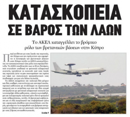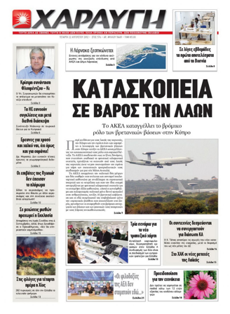 «Κατασκοπεία σε βάρος των λαών» είναι ο πρωτοσέλιδος τίτλος της «Χαραυγής». Το δημοσίευμα αναφέρεται στις πληροφορίες για το ρόλο των βρετανικών βάσεων στην κρίση στη Συρία. Φιλοξενούνται τοποθετήσεις του ΑΚΕΛ αλλά και άλλων κομμάτων καθώς και εκπροσώπου της βρετανικής Υπάτης Αρμοστείας στην Κύπρο για το θέμα. Αλλού η «Χ» αναφέρεται στις αντιδράσεις από ΑΚΕΛ και Δήμο Λάρνακας για τις εξελίξεις σε σχέση με την επένδυση στο παλαιό αεροδρόμιο και στη συνάντηση σήμερα του Υπουργού Συγκοινωνιών με τον Κινέζο επενδυτή για συζήτηση του θέματος. Επίσης η εφημερίδα αναφέρεται στις δηλώσεις του Αριστου Αριστοτέλους, εκπροσώπου της ε/κ πλευράς στη ΔΕΑ, για τις εξελίξεις στο θέμα των ταυτοποιήσεων λειψάνων αγνοουμένων μετά την αποστολή δειγμάτων στο εργαστήριο στη Βοσνία.