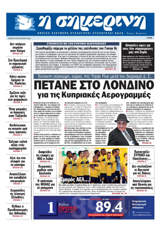 «Η Σημερινή» στεγάζει το κύριό της θέμα υπό τον τίτλο «Πετάνε στο Λονδίνο για τις Κυπριακές Αερογραμμές» και γράφει ότι ο κολοσσός Triple Five που ενδιαφέρεται να αγοράσει τις ΚΑ συνέρχεται εκτάκτως αύριο στο Λονδίνο μετά και την ανακοίνωση των μελών του ΔΣ της εταιρείας για να συζητήσει τα επόμενα βήματά του. Η «Σ» προβάλλει επίσης πρωτοσέλιδα τη σημερινή συνάντηση Γιανγκ Κι και Υπουργού Συγκοινωνιών μετά την επιστολή που απέστειλε ο Κινέζος επενδυτής για απόσυρση του ενδιαφέροντός του για το παλαιό αεροδρόμιο Λάρνακας. Σε άλλο θέμα αναφέρεται στον εγκλωβισμό δύο συμπατριωτών μας στη Συρία και τις προσπάθειες που καταβάλλει το ΥΠΕΞ για ασφαλή μεταφορά τους στην Κύπρο.