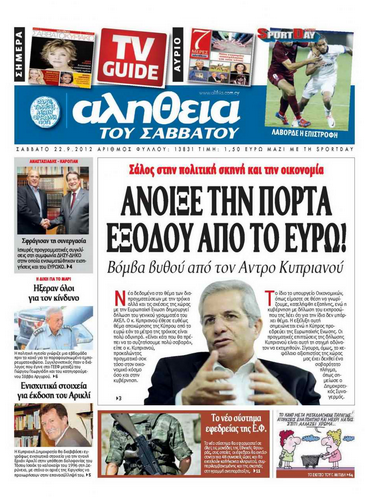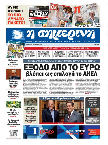 Η «Σημερινή», υπό τον τίτλο «Εξοδο από το Ευρώ βλέπει ως επιλογή το ΑΚΕΛ», γράφει ότι την επιλογή ακόμα και της εξόδου της Κύπρου από την Ευρωζώνη δεν αποκλείει το ΑΚΕΛ, σε περίπτωση που τα μέτρα της Τρόικας θα είναι πολύ οδυνηρά. Γράφει, επίσης, ότι ΔΗΣΥ και ΔΗΚΟ σφράγισαν χθες τη συμφωνία για συνεργασία και το μόνο που απομένει πλέον είναι η επικύρωση από τα συλλογικά όργανα. Επίσης, γράφει ότι ο Συνταγματάρχης Γιώργος Γεωργιάδης προέβη σε κατάθεση-καταπέλτη κατά τη χθεσινή διαδικασία ενώπιον του Κακουργιοδικείου Λάρνακας για την έκρηξη στο Μαρί, λέγοντας ότι δεν λήφθηκαν μέτρα λόγω των συναντήσεων Χριστόφια-Ασαντ.
