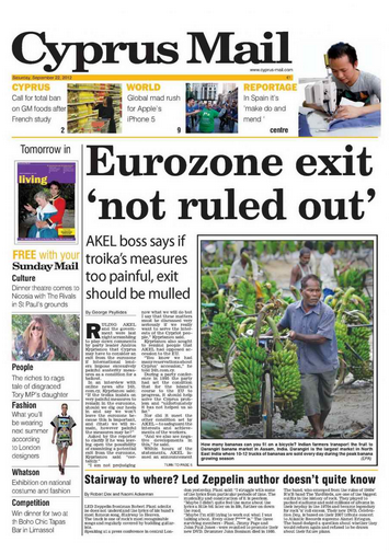 Η αγγλόγλωσση «Cyprus Mail», υπό τον τίτλο «Η αποχώρηση από την Ευρωζώνη ‘δεν αποκλείεται’», γράφει ότι το ΑΚΕΛ και η Κυβέρνηση κατέβαλλαν ψες προσπάθειες να υποβαθμίσουν δηλώσεις του Γενικού Γραμματέα του ΑΚΕΛ ότι η Κύπρος ίσως χρειαστεί να μελετήσει ενδεχόμενη έξοδο από την Ευρωζώνη. Γράφει, επίσης, ότι περιβαλλοντιστές ζητούν πλήρη απαγόρευση των γενετικά τροποποιημένων τροφίμων στην Κύπρο. Επίσης, αναφέρεται στο νέο DVD του θρυλικού συγκροτήματος ροκ Led Zeppelin και σε δήλωση του τραγουδιστή Robert Plant ότι δεν κατανοεί την έννοια των στίχων του πιο διάσημου τραγουδιού τους, του «Stairway to Heaven».