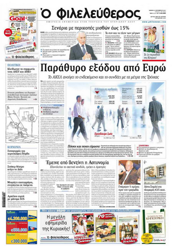 Ο «Φιλελεύθερος», υπό τον τίτλο «Παράθυρο εξόδου από Ευρώ», γράφει ότι για πρώτη φορά ο Γενικός Γραμματέας του ΑΚΕΛ θέτει θέμα εξόδου της Κύπρου από το Ευρώ και προκαλεί νέες θύελλες. Γράφει, επίσης, ότι σημαντικά και ενδιαφέροντα στοιχεία προκύπτουν από την τελευταία απογραφή πληθυσμού και ότι η κυπριακή κοινωνία αλλάζει τόσο στο δημογραφικό χαρακτήρα της, όσο και στις τάσεις, με λιγότερες γεννήσεις, μεγάλο αριθμό ξένων υπηκόων και σημαντική αύξηση διαζυγίων. Επίσης, γράφει ότι από καύσιμα κινδυνεύει να μείνει ο στόλος της Αστυνομίας, αφού το σχετικό κονδύλι έχει σχεδόν εξαντληθεί, πράγμα που επιβεβαίωσε και ο Αρχηγός Αστυνομίας.