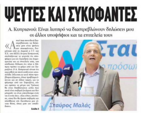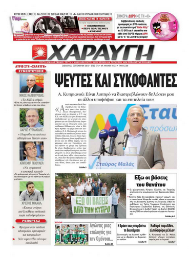 Η «Χαραυγή», υπό τον τίτλο «Ψεύτες και συκοφάντες», γράφει ότι ο Γενικός Γραμματέας του ΑΚΕΛ, σχολιάζοντας το γεγονός ότι του αποδόθηκε δήλωση ότι τάχα η Κύπρος πρέπει να φύγει από την Ευρωζώνη, είπε ότι αυτοί που συνειδητά διαστρεβλώνουν τις δηλώσεις του είναι ψεύτες και συκοφάντες. Γράφει, επίσης, ότι Ε/κ και Τ/κ διαδηλωτές, μαζί με τους συμμετέχοντες σε τριμερή συνάντηση ειρήνης, απαίτησαν την απομάκρυνση των Βρετανικών Βάσεων από την Κύπρο. Επίσης, γράφει ότι ο Αντρος Κυπριανού και ο Σταύρος Μαλάς έστειλαν μήνυμα νικηφόρας πορείας για τις προεδρικές εκλογές σε συγκέντρωση που διοργάνωσε το ΑΚΕΛ στη Λεμεσό.