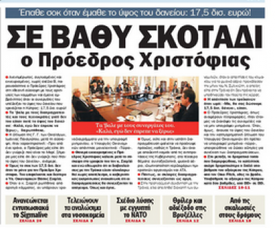 «Η Σημερινή» γράφει στο κύριο της θέμα με τίτλο «Σε βαθύ σκοτάδι ο Πρόεδρος Χριστόφιας» πως ανενημέρωτος, συγχυσμένος και εκνευρισμένος, χωρίς σχέδιο Β, παρουσιάστηκε ο Πρόεδρος Χριστόφια στη χθεσινή σύσκεψη με τους αρχηγούς των κομμάτων και έμεινε εμβρόντητος όταν οι συνεργάτες του υπέδειξαν το ύψος του δανείου που χρειάζεται η Κύπρος: 17,5, δις ευρώ. Αλλού αναφέρει πως τελειώνουν τα αναλώσιμα στα νοσοκομεία, λέγοντας ότι τα χέρια του Υπουργείου Υγείας είναι δεμένα για αγορά προμηθειών. Επίσης αναφέρεται στη 48ωρη απεργία των οικοδόμων, σήμερα και αύριο, με στόχο να εκφράσουν οι εργαζόμενοι την αντίθεσή τους στα μέτρα των εργοδοτών.