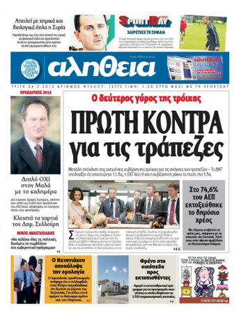 Η «Αλήθεια» γράφει στο κύριο της θέμα, με τίτλο «Πρώτη κόντρα για τις τράπεζες», πως μεγάλη απόκλιση στις εκτιμήσεις Κυβέρνησης – Τρόικας από τις ανάγκες το τραπεζών. Το ΔΝΤ υπολογίζει ότι απαιτούνται 11 δις, η ΕΚΤ λέει 9 και η Κυβέρνηση ρίχνει το ποσό στα 5 δις. Αλλού η εφημερίδα σημειώνει πως στο 74,6% του ΑΕΠ εκτοξεύθηκε το δημόσιο χρέος. Σε άλλο θέμα αναφέρεται σε «διπλό όχι στον Μαλά με το καλημέρα» από ΔΗΚΟ και ΕΔΕΚ, που απάντησαν ότι δεν είναι όμορες δυνάμεις στην πρόσκληση του υποψηφίου προέδρου για συνεργασία.