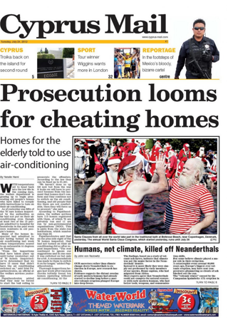 Η αγγλόγλωσση “Cyprus Mail” τιτλοφορεί το κύριο της θέμα «Προδιαγράφονται διώξεις οίκων ευγηρίας» και αναφέρει πως οι κοινωνικές υπηρεσίες του κράτους θα αρχίσουν τις διώξεις κατά οίκων ευγηρίας που δεν συμμορφώθηκαν με τις οδηγίες για να θέτουν σε λειτουργία τα συστήματα κλιματισμού λόγω του καύσωνα. Αλλού αναφέρεται στην επάνοδο της Τρόικας στην Κύπρο για δεύτερο γύρο επαφών. Αλλού η εφημερίδα γράφει πως οι πρόγονοί μας παρά οι κλιματικές αλλαγές οδήγησαν τον πρωτόγονο άνθρωπο – Neanderthal – προς εξαφάνιση στην Ευρώπη σύμφωνα με νέα έρευνα.