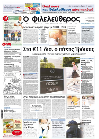 «Ο Φιλελεύθερος» γράφει στο κύριο του θέμα, με τίτλο «Στα 11 δις ευρώ ο πήχης Τρόικας», πως από πολύ ψηλά ξεκινά ο πήχης των διαπραγματεύσεων με την Τρόικα που από σήμερα μπαίνει στα βαθιά νερά. Αλλού αναφέρει πως τις πρώτες ημέρες Αυγούστου αναμένεται να προχωρήσει η Κυβέρνηση στους διορισμούς των νέων ΔΣ μιας σειράς από Ημικρατικούς Οργανισμούς, των οποίων η θητεία λήγει στις 31 Ιουλίου. Σε άλλο θέμα σημειώνει πως το ΔΣ της Cyta, του οποίου η θητεία λήγει σε μια βδομάδα, διόρισε νέο ανώτατο εκτελεστικό διευθυντή του οργανισμού, ο οποίος θα αναλάβει όμως καθήκοντα σε τρεις μήνες.