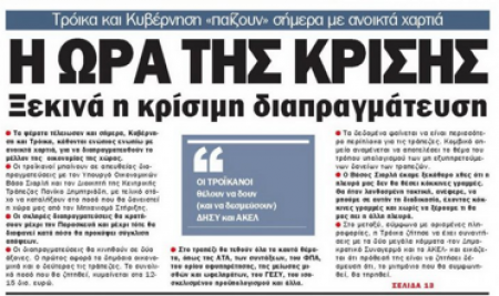 «Η Σημερινή», με κύριο τίτλο «Η ώρα της κρίσης», αναφέρει πως τα ψέματα τέλειωσαν και σήμερα Κυβέρνηση και Τρόικα κάθονται ενώπιον ενωπίω με ανοικτά χαρτιά για να διαπραγματευθούν το μέλλον της οικονομίας της χώρας. Αλλού η εφημερίδα σημειώνει πως ο καναδικός κολοσσός Triple Five επιστρέφει ως από μηχανής θεός με πρόταση προς το Υπουργείο Οικονομικών για αγορά ομολόγων της Κυπριακής Δημοκρατίας της τάξης των 3 δις ευρώ. Σε άλλο θέμα σημειώνεται πως ο υποψήφιος για την Προεδρία Σταύρος Μαλάς δήλωσε πως θα βρίσκεται στο β’ γύρο των προεδρικών εκλογών.