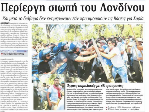 «Ο Φιλελεύθερος» κάτω από τον τίτλο «Περίεργη σιωπή του Λονδίνου», γράφει ότι οι Βρετανοί ακόμα και μετά το διάβημα της Λευκωσίας αποφεύγουν να ενημερώσουν την Κυπριακή Δημοκρατία κατά πόσο χρησιμοποιούν τις Βάσεις στη συριακή διένεξη. Σε δεύτερο του θέμα «ο Φιλελεύθερος» φιλοξενεί και αυτός με τη σειρά του φωτογραφία από τα χτεσινά επεισόδια στο Προεδρικό κάνοντας λόγο για άγριες συμπλοκές με έξι τραυματίες. Αλλού γράφει σε σχέση με τις έρευνες στο υποθαλάσσιο βουνό «Ερατοσθένης» ότι Αμερικανοί, Ρώσοι, Βρετανοί και Γερμανοί κατά καιρούς διενήργησαν γεωτρήσεις ή και μελέτησαν την υποθαλάσσια οροσειρά «Ερατοσθένης» με στόχο, σύμφωνα με πληροφορίες της εφημερίδας, και την πιθανή ανίχνευση υδρογονανθράκων.