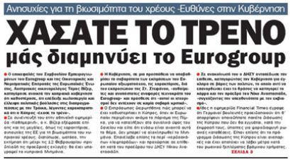 Η «Αλήθεια», υπό τον τίτλο «Χιλιάδες αγωγές από κατόχους αξιογράφων», αναφέρει ότι μορφή χιονοστιβάδας λαμβάνουν πλέον οι αγωγές κατόχων αξιογράφων κατά του Ανδρέα Βγενόπουλου, στελεχών και άλλων μεγαλομετόχων των τραπεζών της Λαϊκής και της Κύπρου και του τέως Διοικητή της ΚΤ Αθανάσιου Ορφανίδη. Γράφει ακόμη ότι ο επικεφαλής του Συμβουλίου Εμπειρογνωμόνων του Eurogroup αποδίδει την καθυστέρηση στη λήψη μέτρων στην κωλυσιεργία της κυβέρνησης Χριστόφια. Ακόμη, αναφέρει ότι οι ξένοι επενδυτές είναι επιφυλακτικοί αναμένοντας να δουν την κατάληξη στο θέμα του Μνημονίου, όπως σημειώνει ο Πρόεδρος του ΕΒΕ Πάφου Γιώργος Λεπτός.