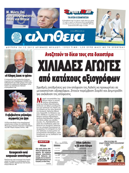 Η «Αλήθεια», υπό τον τίτλο «Χιλιάδες αγωγές από κατόχους αξιογράφων», αναφέρει ότι μορφή χιονοστιβάδας λαμβάνουν πλέον οι αγωγές κατόχων αξιογράφων κατά του Ανδρέα Βγενόπουλου, στελεχών και άλλων μεγαλομετόχων των τραπεζών της Λαϊκής και της Κύπρου και του τέως Διοικητή της ΚΤ Αθανάσιου Ορφανίδη. Γράφει ακόμη ότι ο επικεφαλής του Συμβουλίου Εμπειρογνωμόνων του Eurogroup αποδίδει την καθυστέρηση στη λήψη μέτρων στην κωλυσιεργία της κυβέρνησης Χριστόφια. Ακόμη, αναφέρει ότι οι ξένοι επενδυτές είναι επιφυλακτικοί αναμένοντας να δουν την κατάληξη στο θέμα του Μνημονίου, όπως σημειώνει ο Πρόεδρος του ΕΒΕ Πάφου Γιώργος Λεπτός.