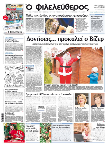 «Δονήσεις… προκαλεί ο Βίζερ» είναι ο τίτλος του «Φιλελεύθερου», που αναφέρει στο κύριο του θέμα ότι με ηφαίστειο μοιάζει το πολιτικό σκηνικό μετά το μπαράζ αντιδράσεων στην αναφορά του επικεφαλής του Συμβουλίου Εμπειρογνωμόνων του Eurogroup, Τόμας Βίζερ με την αντιπολίτευση να εντείνει τις επικρίσεις της και την Κυβέρνηση να απαντά. Επίσης αναφέρει ότι σε μήλο της έριδος αποτελούν οι αναποφάσιστοι ψηφοφόροι με τα εκλογικά επιτελεία να επιστρατεύουν δυνάμεις ενόψει της τελικής ευθείας στρέφοντας πρωτίστως την προσοχή τους στους αναποφάσιστους. Ακόμη, γράφει ότι δραματικό SOS εκπέμπουν και πάλι τα παγκύπρια τηλεοπτικά κανάλια σε μια ύστατη προσπάθεια που καταβάλλουν από κοινού με στόχο να κρατηθούν στον αέρα και να μην κατεβάσουν ρολά.