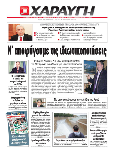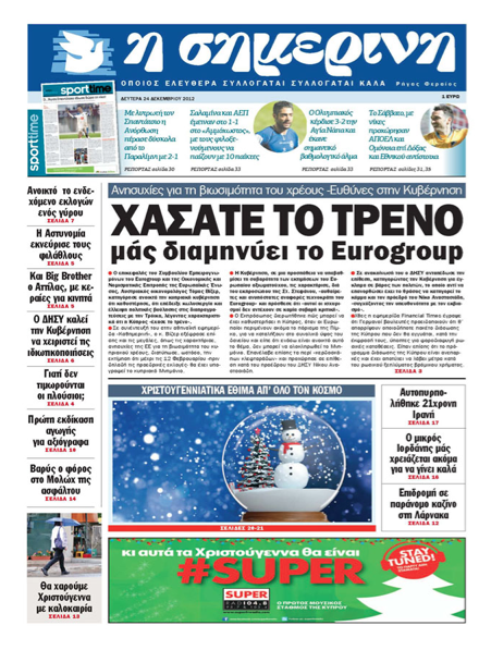 Υπό τον τίτλο «Χάσατε το τρένο μας διαμηνύει το Eurogroup» η «Σημερινή» γράφει στο κύριο της θέμα ότι ο επικεφαλής του Συμβουλίου Εμπειρογνωμόνων του Eurogroup και την Οικονομικής και Νομισματικής Επιτροπής της ΕΕ, Αυστριακός οικονομολόγος Τόμας Βίζερ κατηγόρησε ανοικτά την κυπριακή κυβέρνηση ότι καθυστέρησε, ότι επέδειξε κωλυσιεργία και έλλειψη πολιτικής βούλησης στις διαπραγματεύσεις με την Τρόικα λέγοντας χαρακτηριστικά ότι η Κύπρος «έχασε το τρένο». Ακόμη, γράφει ότι ανοικτό είναι το ενδεχόμενο για εκλογές ενός γύρου στις προεδρικές εκλογές του Φεβρουαρίου. Η εφημερίδα γράφει επίσης ότι θα χαρούμε Χριστούγεννα με καλοκαιρία.