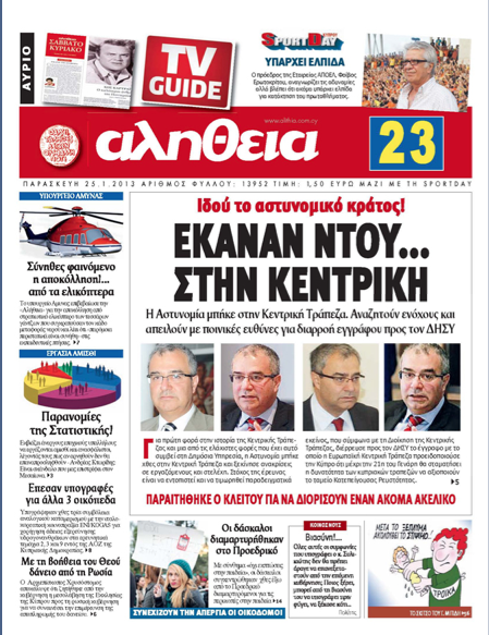 Η «Αλήθεια» τιτλοφορεί το κύριο της θέμα «Έκαναν ντου…στην Κεντρική» και γράφει ότι για πρώτη φορά στην ιστορία της Κεντρικής Τράπεζας και μια από τις ελάχιστες φορές που έχει αυτό συμβεί στη Δημόσια Υπηρεσία, η Αστυνομία μπήκε χθες στην Κεντρική Τράπεζα και ξεκίνησε ανακρίσεις σε εργαζόμενους και στελέχη. Σε άλλο θέμα της από την πρώτη σελίδα, η εφημερίδα γράφει ότι το Υπουργείο Άμυνας επιβεβαίωσε πλήρως τη χθεσινή είδησή της για την αποκόλληση από ελικόπτερο της Εθνικής Φρουράς των τεσσάρων γάντζων που συγκρατούσαν τον κάδο μεταφοράς νερού. Αλλού η εφημερίδα κάνει λόγο για «παρανομίες της Στατιστικής Υπηρεσίες», η οποία, σύμφωνα με το δημοσίευμα, εκβιάζει εποχικούς υπαλλήλους που απολύθηκαν να εργάζονται αμισθί και ανασφάλιστοι, λέγοντας τους πως αν αρνηθούν θα κοπούν από τη λίστα για επαναπρόσληψη.