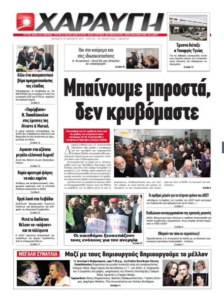 Η «Χαραυγή» τιτλοφορεί το κύριο της θέμα «Μπαίνουμε μπροστά, δεν κρυβόμαστε» και αναφέρει ότι ο υποψήφιος για την προεδρία της Δημοκρατίας Σταύρος Μαλάς εξαπέλυσε χθες βράδυ δριμεία επίθεση εναντίον του Νίκου Αναστασιάδη στην προεκλογική συγκέντρωση στο σωματείο «Αναγέννηση» στην Παλλουριώτισσα. Αλλού, γράφει ότι η Υπουργός Υγείας Ανδρούλα Αγρότου διέταξε έρευνα μετά την επιστολή που έλαβε από παραπονούμενη ασθενή, η οποία κατήγγειλε ότι δεν έτυχε του ενδεδειγμένου χειρισμού κατά την εξέταση της από ιατρούς της Γυναικολογικής Κλινικής του Μακάρειου Νοσοκομείου. Σε άλλο θέμα της, εφημερίδα, επικαλούμενη πληροφορίες, γράφει ότι «παρέμβαση» στις έρευνες για τις ευθύνες που υπάρχουν σχετικά με την κατάσταση στην οποία περιήλθαν οι τράπεζες, φαίνεται ότι έκανε ο Νικόλας Παπαδόπουλος.
