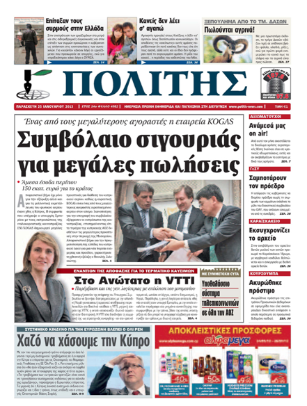 Ο «Πολίτης» στο κύριο θέμα του υπό τον τίτλο «Συμβόλαιο σιγουριάς για μεγάλες πωλήσεις», αναφέρεται στη χθεσινή υπογραφή τριών συμβολαίων με την Κοινοπραξία ENI/KOGAS για χορήγηση άδειας εξερεύνησης υδρογονανθράκων και γράφει ότι η Κύπρος έκανε ένα αποφασιστικό βήμα όχι μόνο για την εξόρυξη αλλά και για τη μελλοντική εκμετάλλευση του φυσικού αερίου. Αλλού, η εφημερίδα γράφει ότι η VTTI κατέθεσε προσφυγή εναντίον της απόφασης του Υπουργικού Συμβουλίου να ξεκινήσει διαπραγματεύσεις με την ολλανδική Vopak για κατασκευή τερματικού αποθήκευσης πετρελαιοειδών στο Βασιλικό. Γράφει, επίσης, ότι με τον πιο κατηγορηματικό τρόπο απέρριψε τα όσα λέγονται περί μη συστημικού προβλήματος σε ό,τι αφορά την Κύπρο ο επίτροπος για τις Οικονομικές και Νομισματικές Υποθέσεις της ΕΕ Όλι Ρεν.