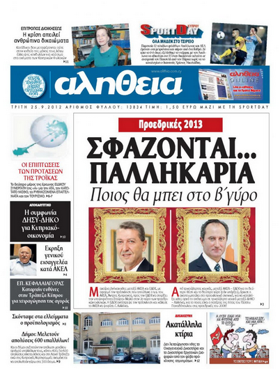 Η «Αλήθεια» στεγάζει το κύριό της θέμα υπό τον τίτλο «Σφάζονται… Παλληκάρια» και γράφει για διαξιφισμούς ΑΚΕΛ – ΕΔΕΚ ως προς το κατά πόσο θα περάσει στο 2ο γύρο των Προεδρικών ο Γιώργος Λιλλήκας ή ο Σταύρος Μαλάς. Αλλού, προβάλλει δεύτερο μέρος έρευνας που διενέργησε συνεργάτης της για τις επιπτώσεις των προτάσεων της Τρόικας για την ΑΤΑ, τον κατώτατο μισθό, τα ρυθμιζόμενα επαγγέλματα και τον τουρισμό. Σε άλλο της θέμα υπό τον υπότιτλο ‘αποκαλυπτικό’ γράφει για τη συμφωνία ΔΗΣΥ – ΔΗΚΟ για το Κυπριακό και την οικονομία.