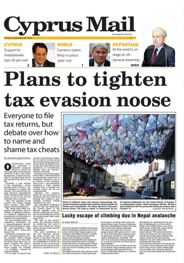 Η αγγλόγλωσση «Cyprus Mail» στεγάζει το κύριο της θέμα υπό τον τίτλο «Σχέδια για να σφίξει η θηλιά γύρω από τους φοροφυγάδες» και γράφει για πρόταση νόμου του ΔΗΣΥ που θα κατατεθεί την Πέμπτη και η οποία θα προνοεί την υποβολή φορολογικής δήλωσης από όλους, μετά την αποκάλυψη ότι ένας στους δύο δεν έχουν φορολογικό φάκελο. Σε άλλο της θέμα η εφημερίδα φιλοξενεί δηλώσεις δύο Ιταλών ορειβατών που στάθηκαν τυχεροί και γλίτωσαν από χιονοστιβάδα στο Νεπάλ που σκότωσε τουλάχιστον 11 ανθρώπους. Αλλού γράφει ότι η υποστήριξη για τον Νίκο Αναστασιάδη ξεπερνά το 35%.