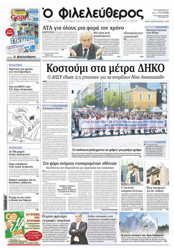 «Κοστούμι στα μέτρα ΔΗΚΟ» είναι ο τίτλος του κύριου θέματος του «Φιλελευθέρου», που γράφει ότι ο ΔΗΣΥ ικανοποίησε πλήρως τις απαιτήσεις του ΔΗΚΟ στο Κυπριακό σύμφωνα με το περίγραμμα των προγραμματικών θέσεων που θα τεθεί ενώπιον της Κεντρικής Επιτροπής του κόμματος την Πέμπτη. Σε άλλο της θέμα η εφημερίδα γράφει για την πρόταση της Κυβέρνησης για διαφοροποίηση του θεσμού της ΑΤΑ με κλιμακωτή καταβολή από μηνιαίες απολαβές 2.400 ευρώ και με οροφή τις 5.000 ευρώ και καταβολή της μια φορά το χρόνο. Αλλού αναφέρεται στην απόφαση του Επιτρόπου Προστασίας Προσωπικών Δεδομένων και της Αρχής Αντιντόπιγκ να δίνονται στη δημοσιότητα ονόματα αθλητών που κάνουν χρήση αναβολικών ή άλλων ουσιών σε μια προσπάθεια να παταχθεί το φαινόμενο.