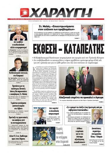 Η «Χαραυγή» με τίτλο «Εκθεση – Καταπέλτης» γράφει ότι η Κεφαλαιαγορά διαπίστωσε χειραγώγηση της αγοράς από την Τράπεζα Κύπρου και ότι αν επιβεβαιωθούν οι καταγγελίες προνοείται πρόστιμο μέχρι 341 χιλιάδες ευρώ για την τράπεζα και για το κάθε μέλος του ΔΣ που υπέπεσε σε παράπτωμα. Αλλού η εφημερίδα γράφει ότι ο Πρόεδρος Χριστόφιας κατήγγειλε στη Νέα Υόρκη την τουρκική αδιαλλαξία και αποκάλυψε ότι τα Ηνωμένα Εθνη θα ετοιμάσουν έγγραφο με τις μέχρι τώρα συγκλίσεις. Σε άλλο της θέμα η εφημερίδα προβάλλει δηλώσεις του Σταύρου Μαλά από την Πύλα ότι θα επικεντρωθεί στην επίλυση των προβλημάτων, καθώς και ότι ο Νίκος Αναστασιάδης δεν έχει τίποτα το προοδευτικό να προσφέρει στο λαό.