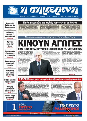 Με τον τίτλο «Κινούν Αγωγές», η «Σημερινή» επικαλείται πληροφορίες και γράφει ότι εκατοντάδες κάτοχοι αξιογράφων δρομολογούν καταχωρίσεις αγωγών κατά τραπεζών, του Προέδρου της Δημοκρατίας, του Υπουργού Οικονομικών και της Κεντρικής Τράπεζας. Σε άλλο θέμα η εφημερίδα γράφει ότι ΔΗΚΟ και ΔΗΣΥ διέγραψαν από το έγγραφο της συμφωνίας τους τον όρο ‘λύση διζωνικής δικοινοτικής ομοσπονδίας’ και την αντικατέστησαν με αναφορά «στη μορφή λύσης που έχουμε αποδεχθεί ως ιστορικό και οδυνηρό συμβιβασμό», για διευκόλυνση της ένταξης στη συμμαχία του ΕΥΡΩΚΟ. Αλλού γράφει ότι λόγω της κρίσης παιδιά πολύτεκνων οικογενειών πηγαίνουν στο σχολείο πεινασμένα.